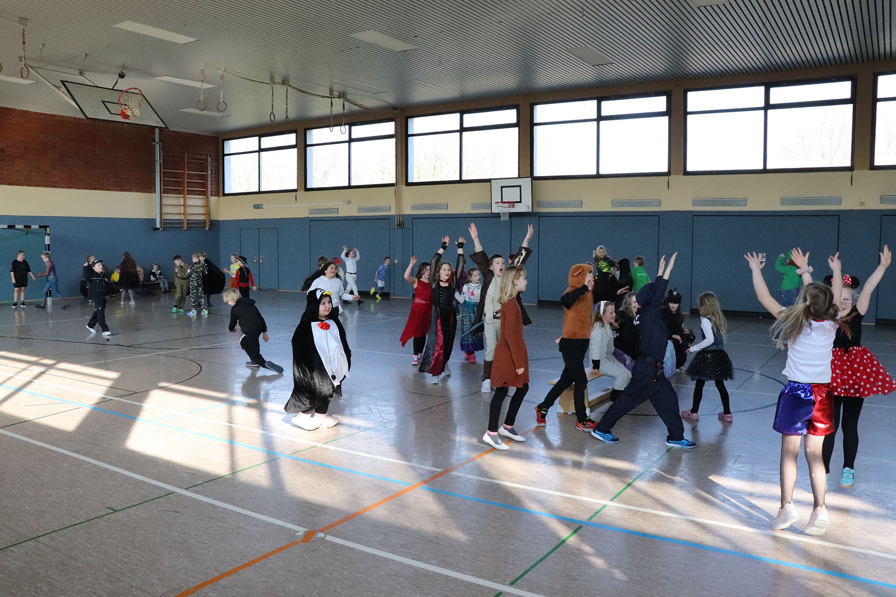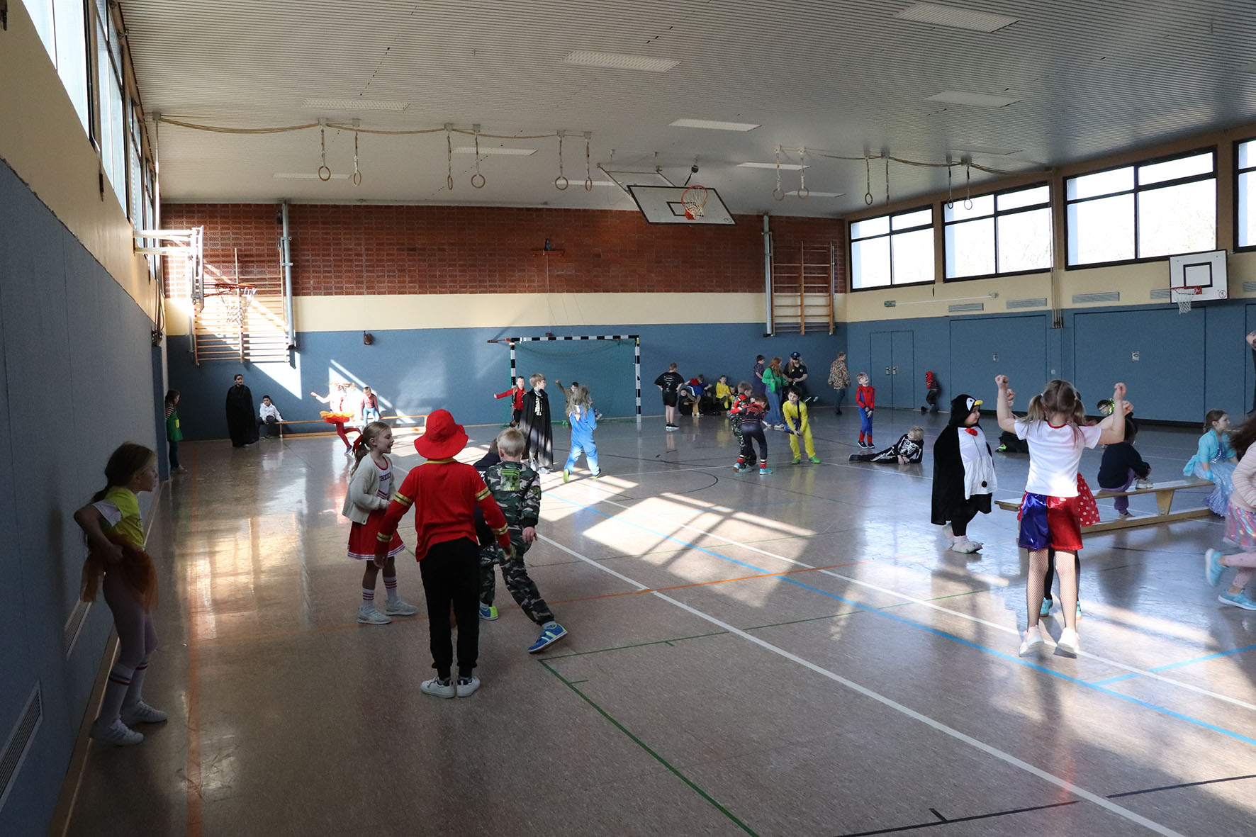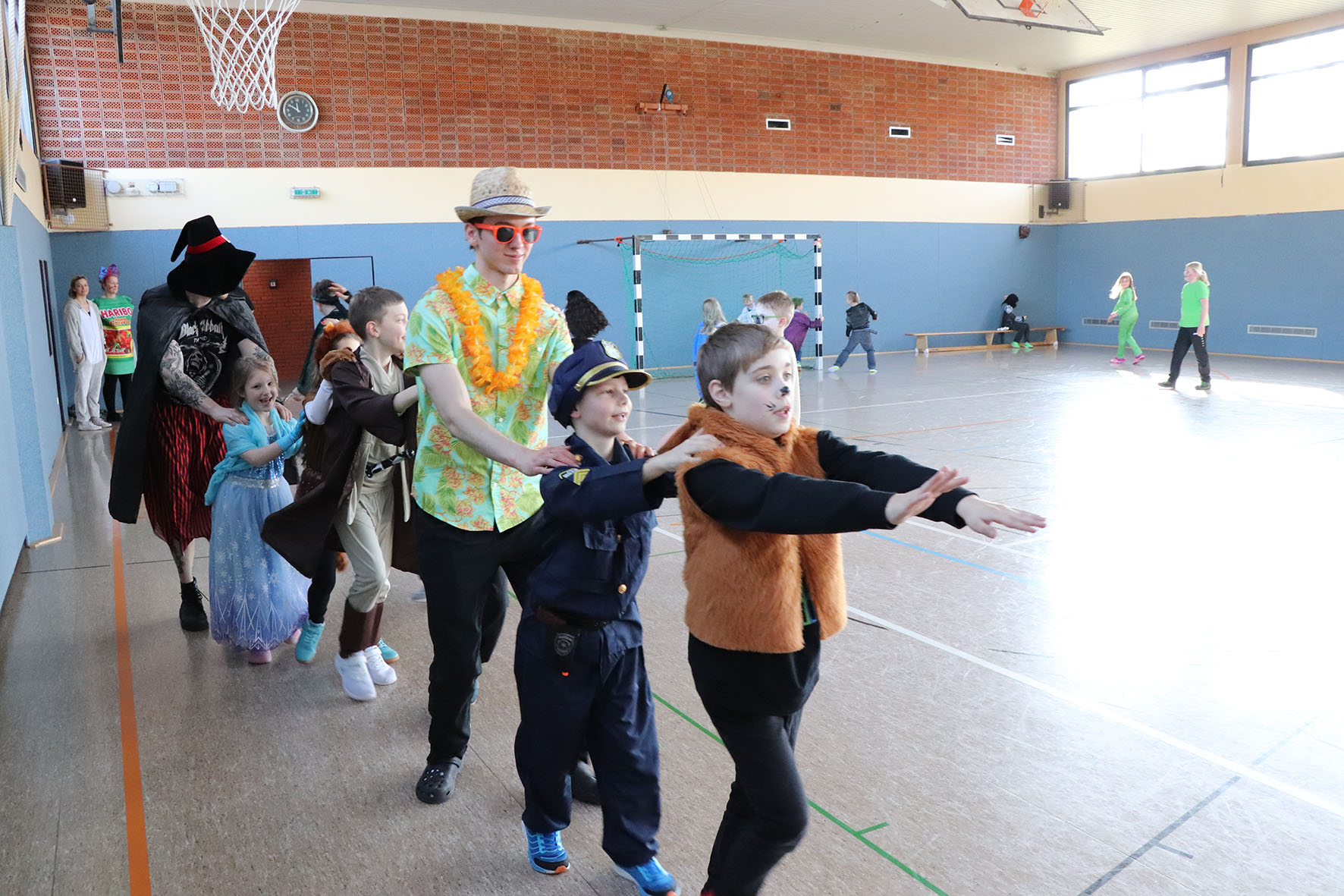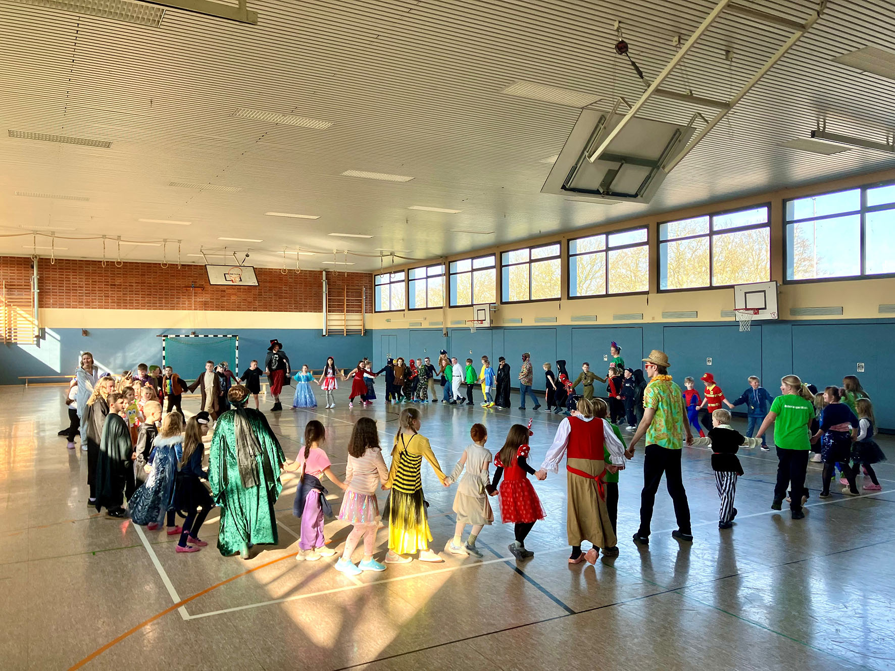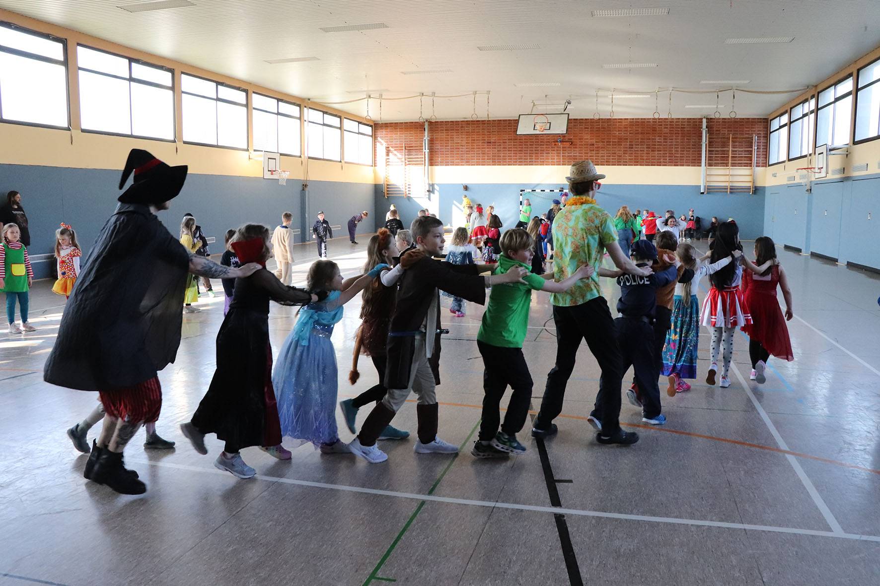 Alle kommen verkleidet zur Schule und feiern den ganzen Vormittag Karneval.