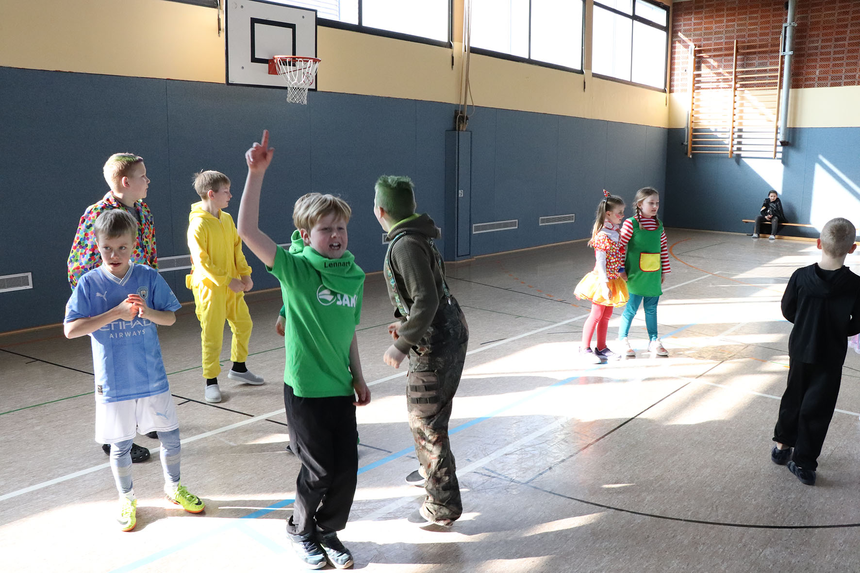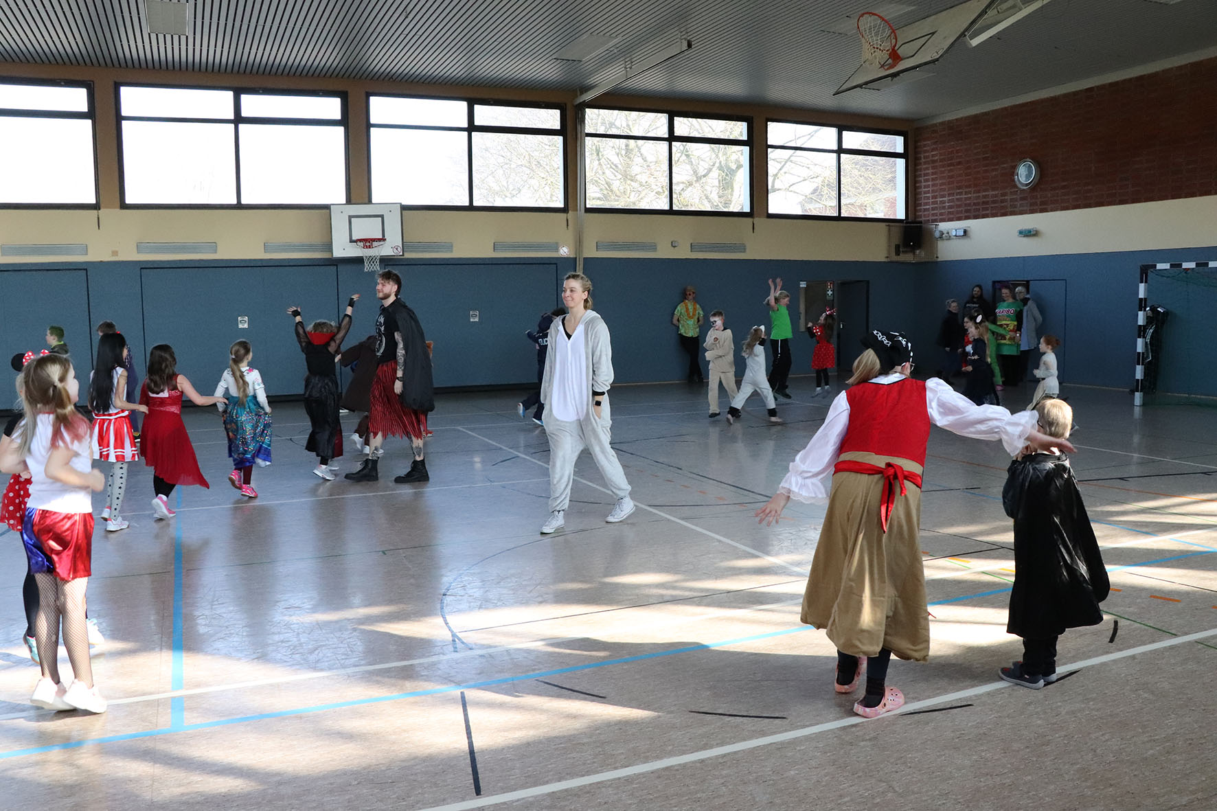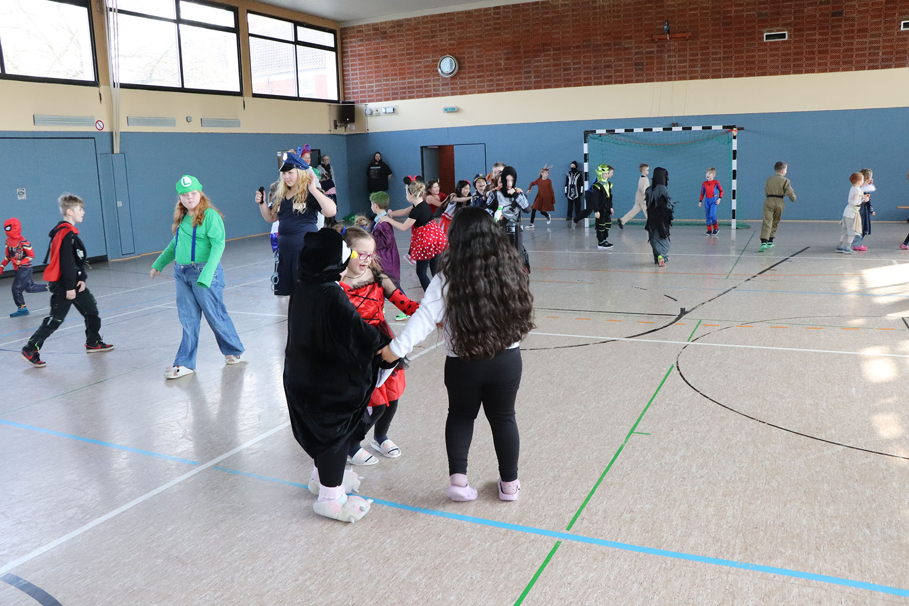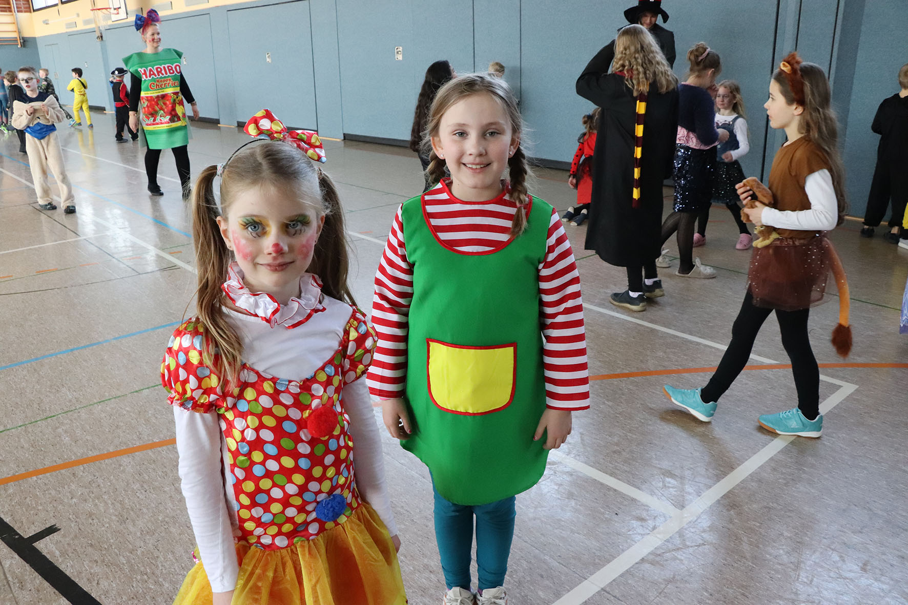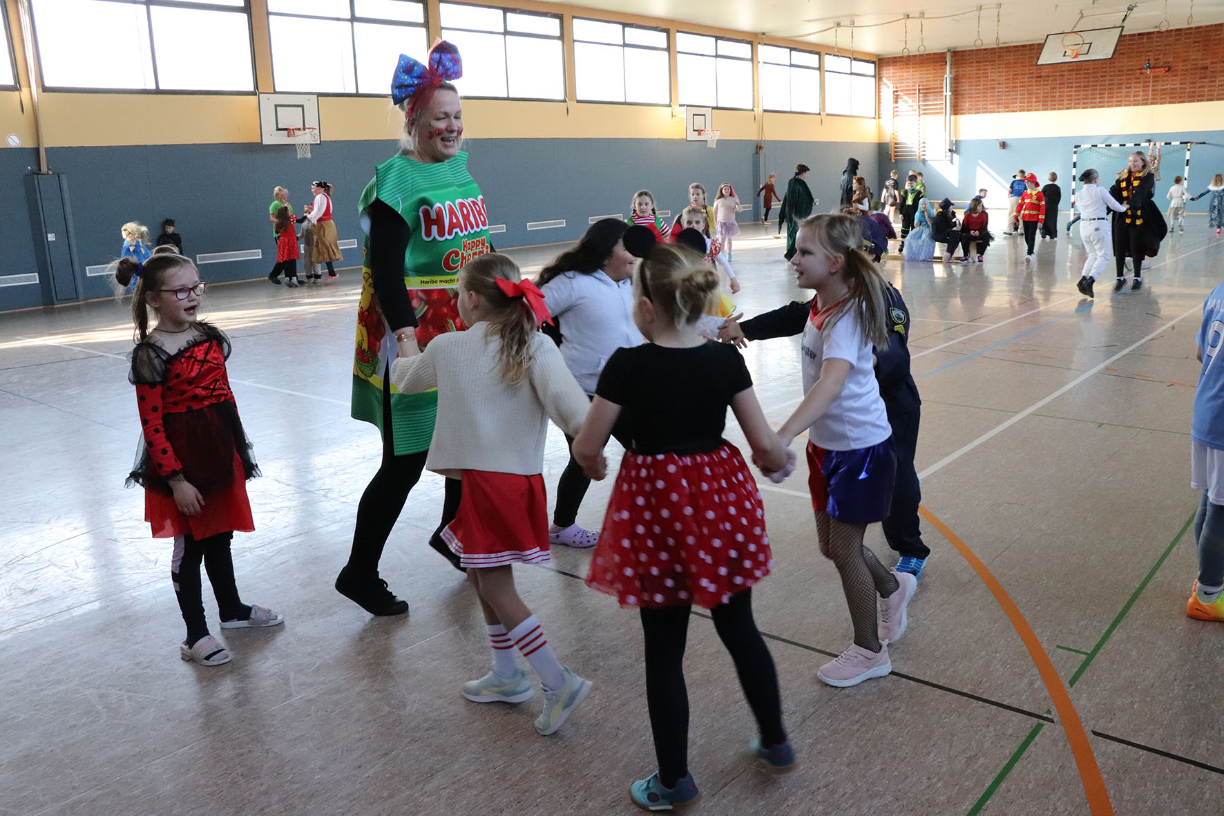 Alle kommen verkleidet zur Schule und feiern den ganzen Vormittag Karneval.