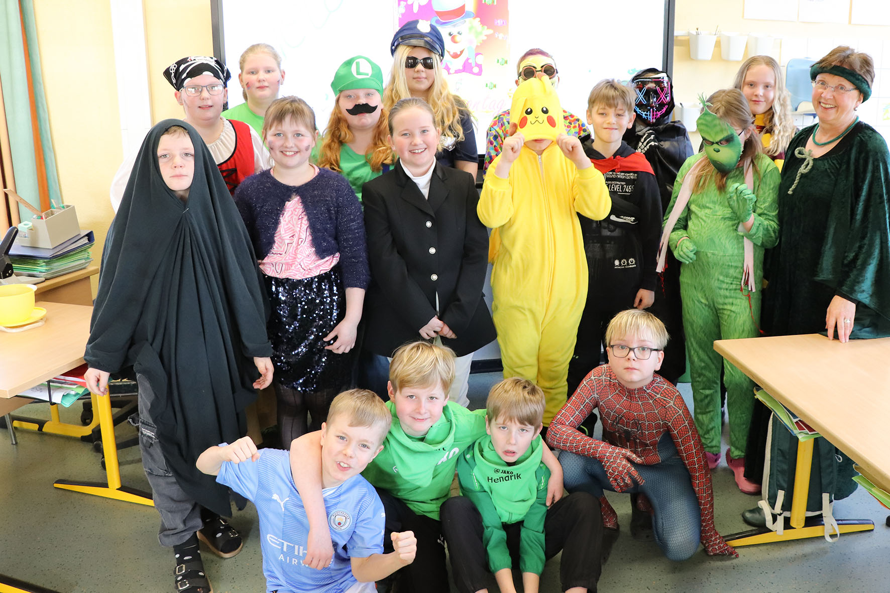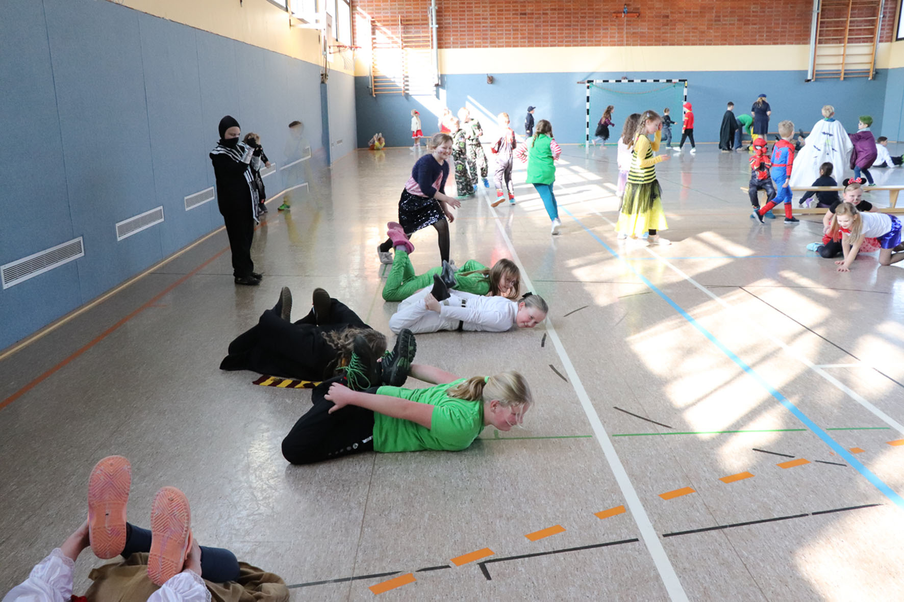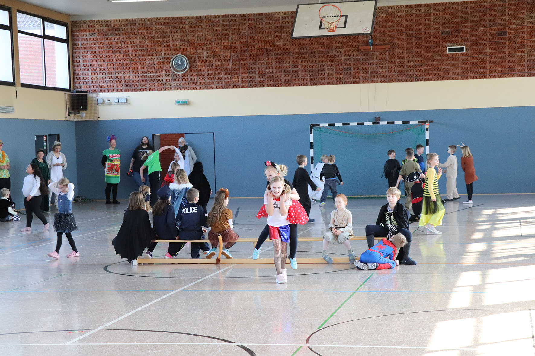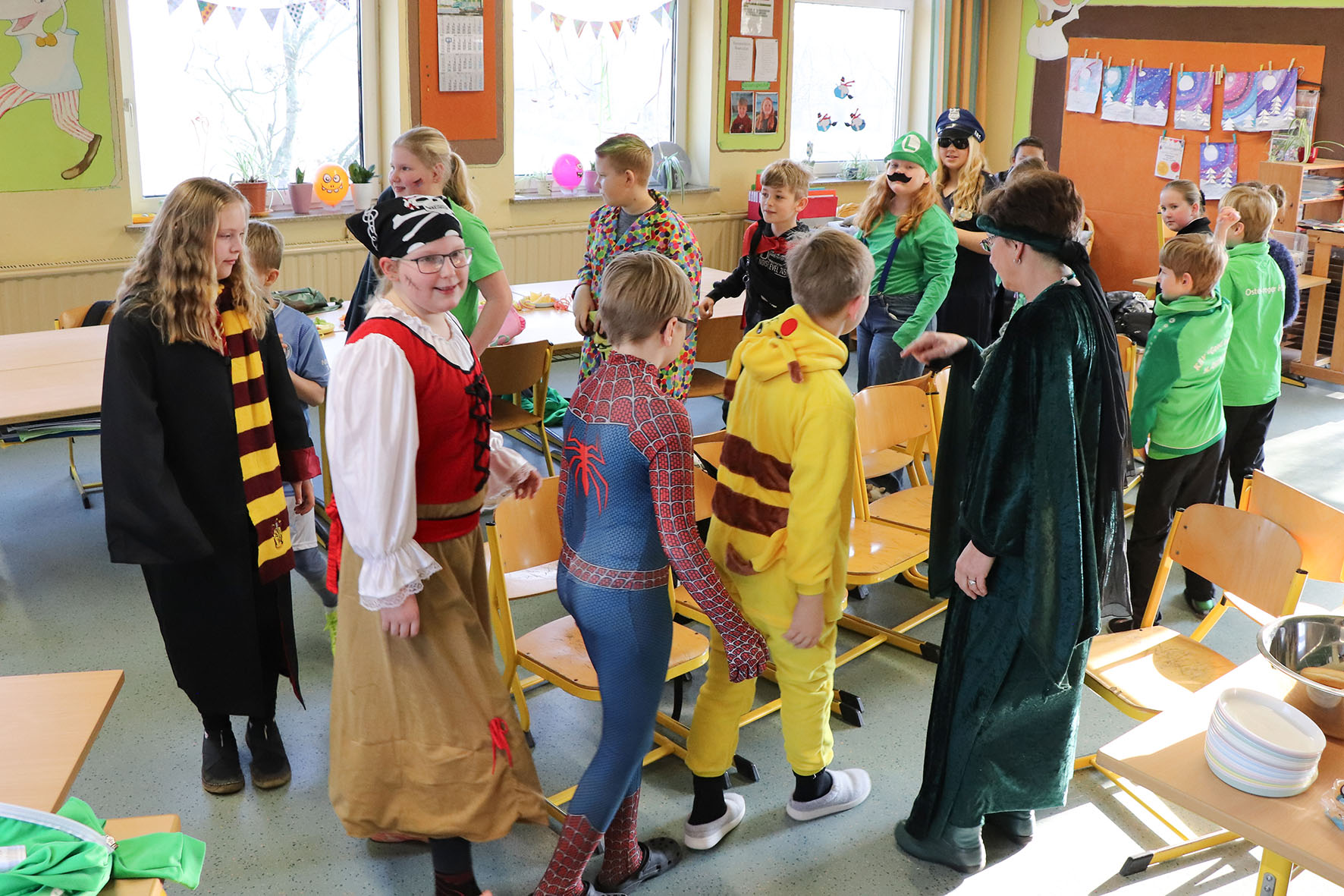 Alle kommen verkleidet zur Schule und feiern den ganzen Vormittag Karneval.