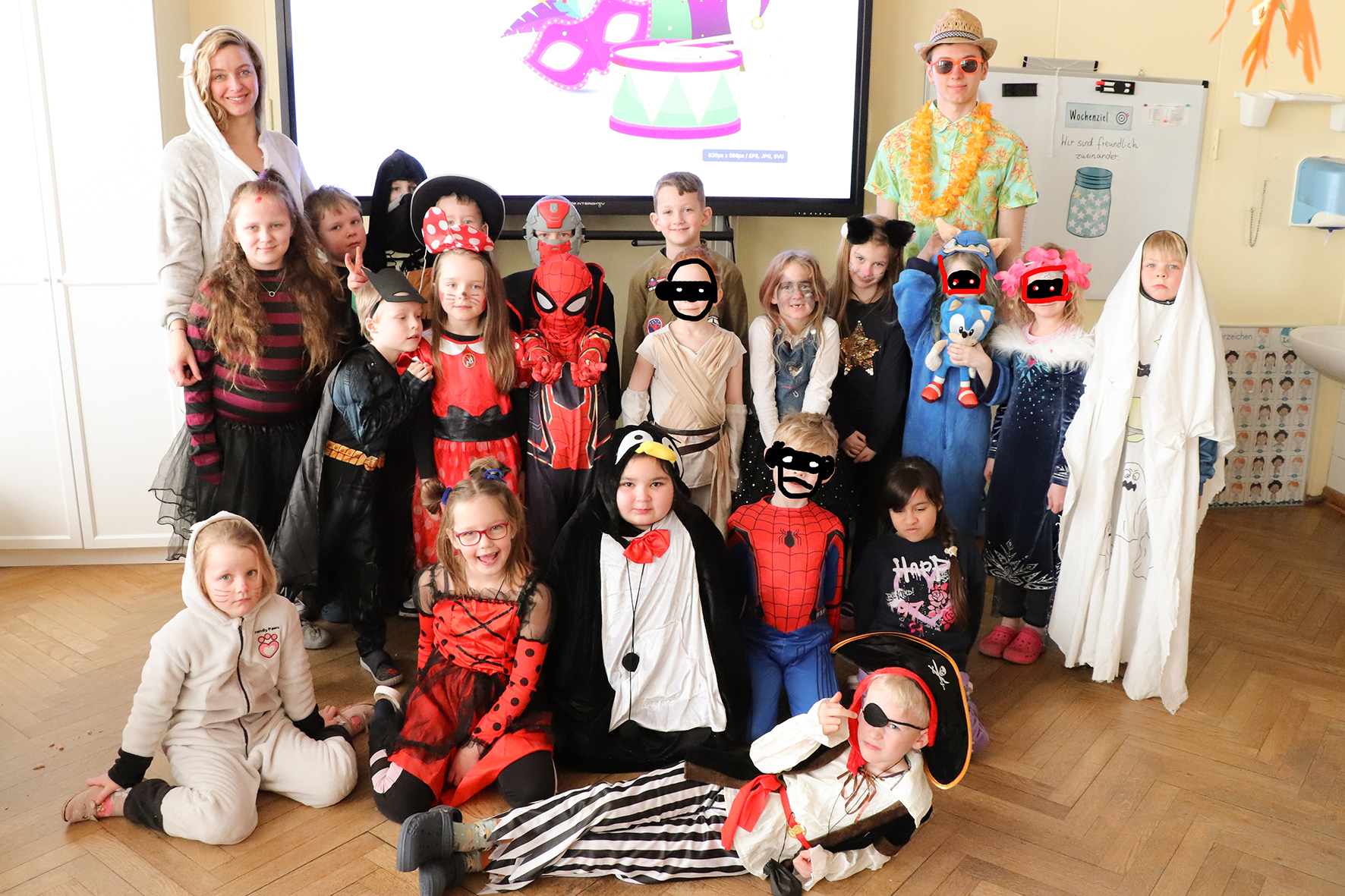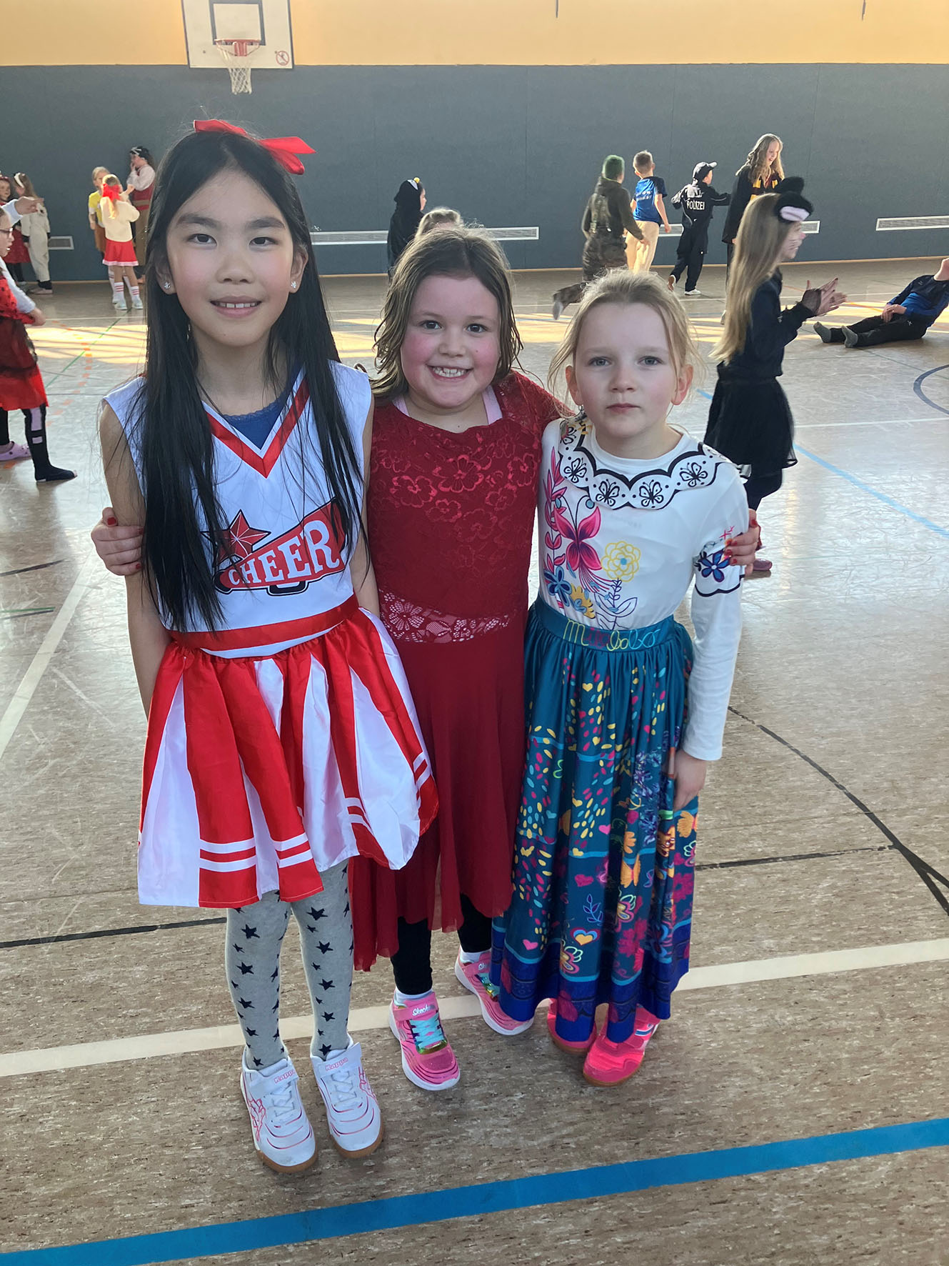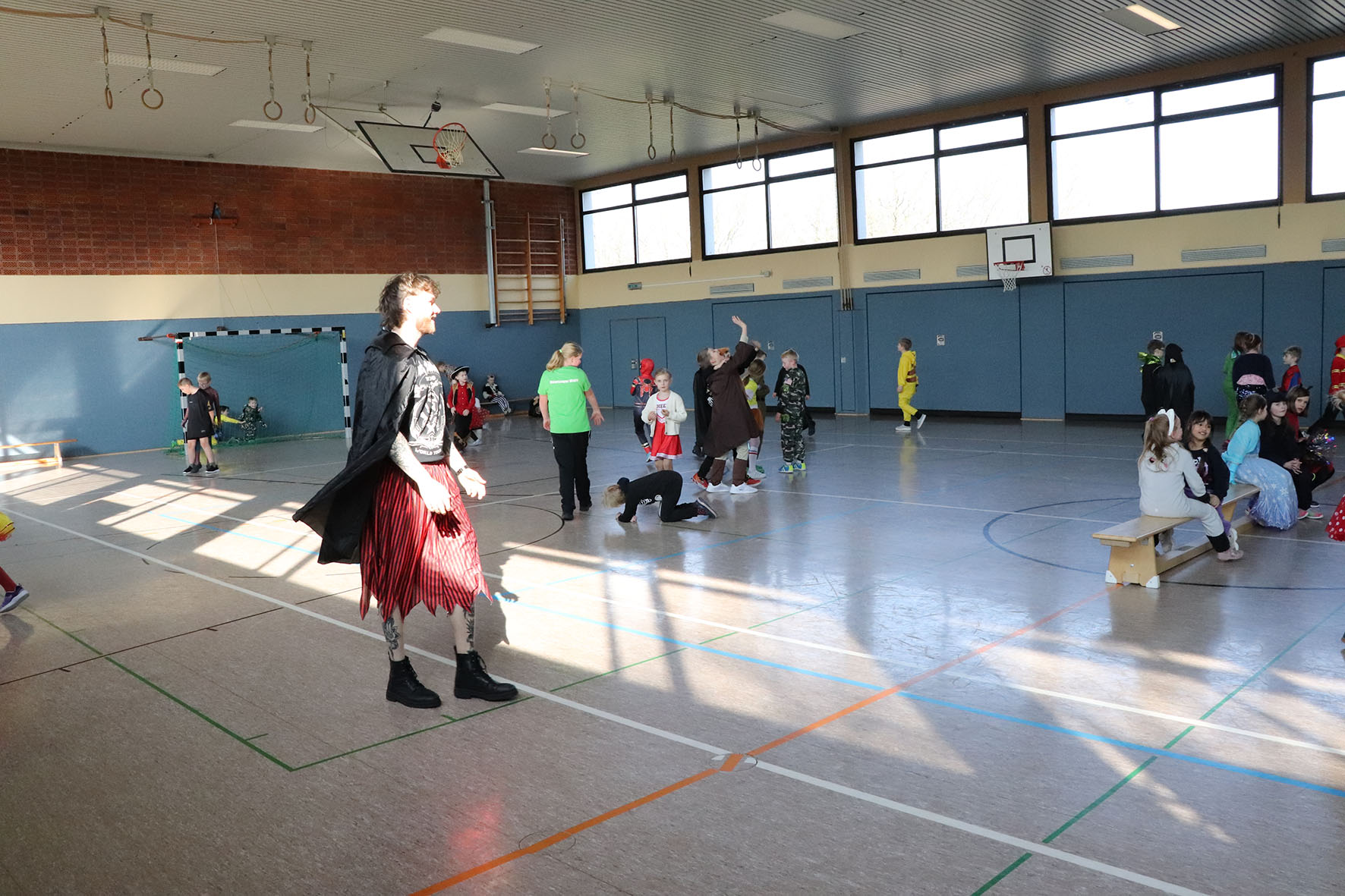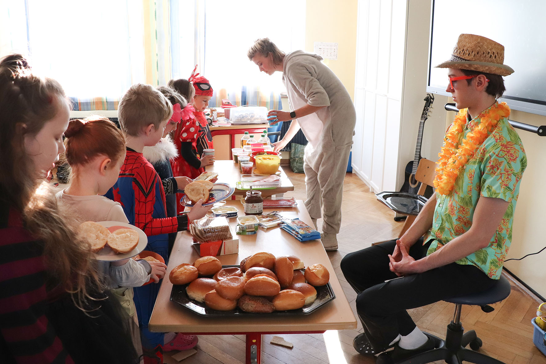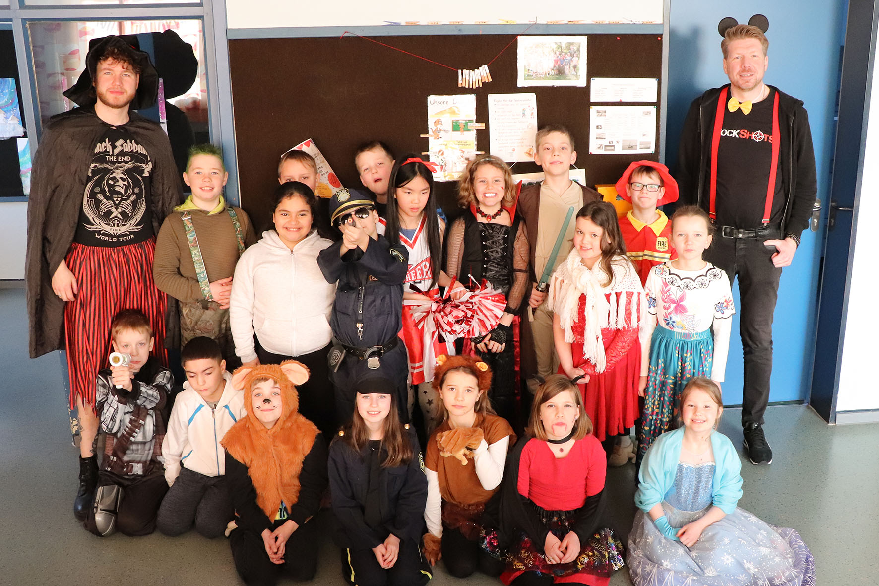 Alle kommen verkleidet zur Schule und feiern den ganzen Vormittag Karneval.